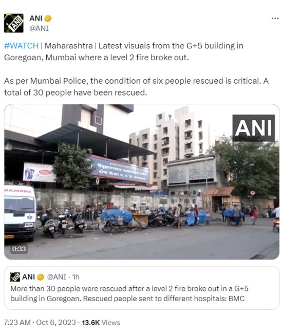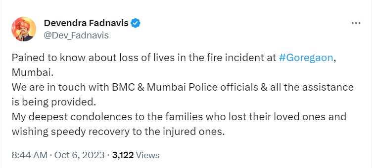 गोरेगांव में आग लगने की घटना पर महाराष्ट्र के उप मुख्यमंत्री देवेंद्र फडणवीस ने भी दुख व्यक्त किया। उन्होंने X पर ट्वीट कर कहा, मुंबई के गोरेगांव में आग लगने की घटना में जानमाल के नुकसान के बारे में जानकर दुख हुआ। हम बीएमसी और मुंबई पुलिस अधिकारियों के संपर्क में हैं और सभी सहायता प्रदान की जा रही है।