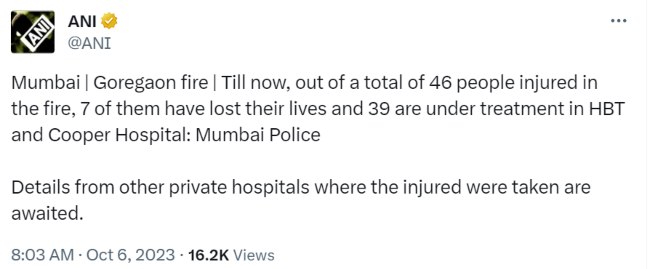 गोरेगांव में जी+5 इमारत में लगी आग में अब तक घायल हुए कुल 46 लोगों में से 7 की मौत हो चुकी है और 39 का इलाज एचबीटी और कूपर अस्पताल में चल रहा है। इसकी जानकारी मुंबई पुलिस द्वारा दी गई है।