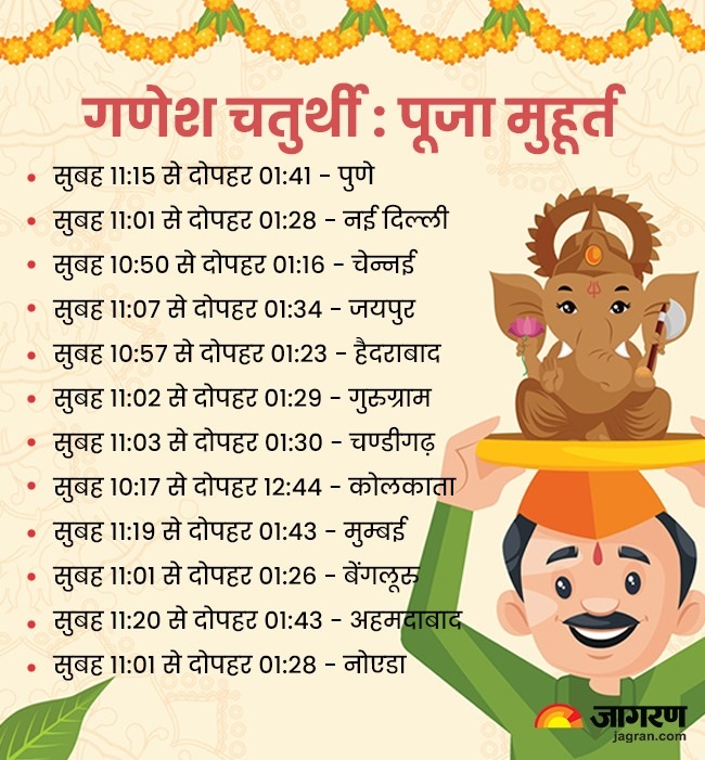 पूरे देश में 19 सितंबर को गणेश चतुर्थी की पूजा शुरू हो जाएगी। इस दिन अगल-अलग शहरों में पूजा का मुहूर्त होगा। पुणे में गणेश चतुर्थी की पूजा का मुहूर्त सुबह 11:15 से दोपहर 01:41 तक रहेगा। वहीं, नई दिल्ली में पूजा का मुहूर्त सुबह 11:01 से दोपहर 01:28 तक रहेगा। चेन्नई में पूजा का मुहूर्त 10:50 से दोपहर 01:16 तक रहेगा।