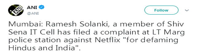 शिवसेना आईटी सेल के सदस्य रमेश सोलंकी ने नेट नेटफ्लिक्स पर आरोप लगाते हुए एलटी मार्ग पुलिस स्टेशन में शिकायत दर्ज कराई है ...और पढ़ें