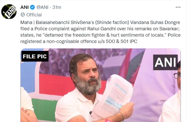 शिंदे गुट की वंदना सुहास डोंगरे ने सावरकर पर की गई टिप्पणी को लेकर पुलिस में शिकायत दर्ज कराने के साथ ही कहा कि राहुल गांधी ने स्वतंत्रता सेनानी को बदनाम किया है। उन्होंने स्थानीय लोगों को आहत किया है। महाराष्ट्र पुलिस ने धारा 500 और 501 आईपीसी के तहत मामला दर्ज किया है।