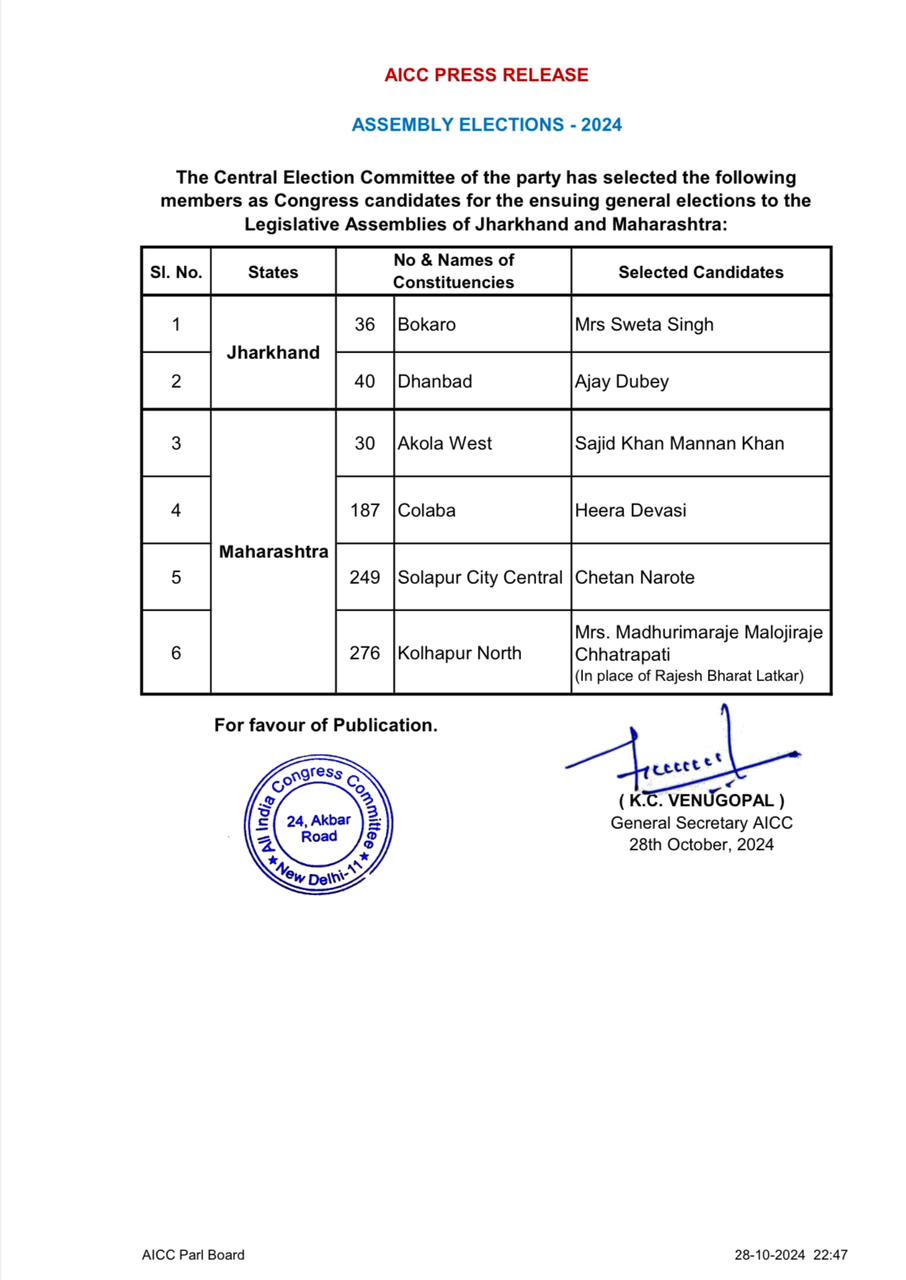 सोमवार को कांग्रेस ने झारंखड की दो विधानसभा और महाराराष्ट्र की चार विधानसभा सीटों पर प्रत्याशियों का एलान किया है। महाराष्ट्र की अकोला पश्चिम से साजिद खान मन्नान खान को प्रत्याशी बनाया गया है। कोलाबा से दीरा देवासी चुनाव लड़ेंगे। सोलापुर सिटी सेंट्रल विधानसभा सीट से चेतन नरोटे मैदान में होंगे। कोल्हापुर उत्तर सीट पर राजेश भारत लटकर के स्थान पर मधुरिमाराजे मालोजीराजे छत्रपति को उतारा गया है। रविवार को कांग्रेस ने 14 प्रत्याशियों का एलान किया था। झारखंड के बोकारो से श्वेता सिंह और धनबाद से अजय दुबे को प्रत्याशी बनाया गया है।