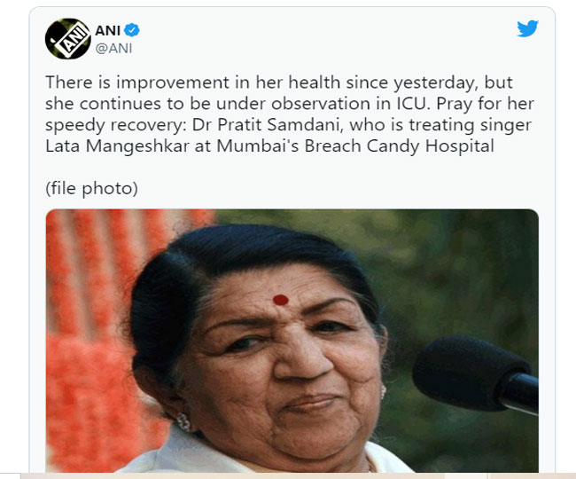 जानकारी हो कि हिंदी सिनेमा की मशहूर गायिका लता मंगेश्कर अभी भी आइसीयू वार्ड में हैं। उनका इलाज कर रहे डॉ प्रतीत समदानी से मिली जानकारी के अनुसार उनकी हालत में अब पहले से सुधार है। मुंबई के ब्रीच कैंडी अस्पताल में उनका इलाज चल रहा है। बता दें कि बीते कुछ दिन पहले उन्हें कोरोना संक्रमित होने के बाद अस्पताल में भर्ती करवाया गया था, उन्हें निमोनिया की भी शिकायत थी। डॉ प्रतीत समदानी ने सभी से उनके शीघ्र स्वस्थ होने के लिए प्रार्थना करने को कहा है।