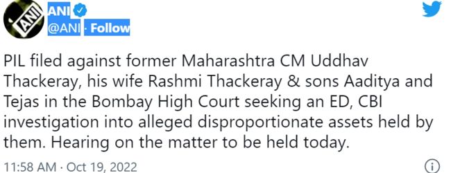 उद्धव ठाकरे की पत्नी और बेटों आदित्य व तेजस के खिलाफ बॉम्बे हाई कोर्ट में याचिका दायर की गई है। आय से अधिक संपत्ति होने के मामले में प्रवर्तन निदेशायल और सीबीआई जांच की मांग की गई है। जिसकी सुनवाई आज बॉम्बे हाई कोर्ट में होने वाली है।