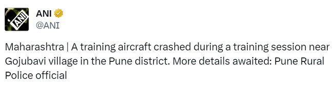 पुणे ग्रामीण के एक पुलिस अधिकारी ने बताया कि पुणे जिले के गोजुबावी गांव के पास एक प्रशिक्षण सत्र के दौरान एक ट्रेनिंग विमान दुर्घटनाग्रस्त हो गया।