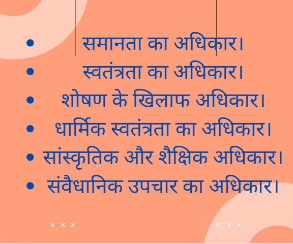 हमारे संविधान में जाति, धर्म, ऊंच, नीच को परे रखकर तैयार किया गया है। इसमें देश के हर नगरिक चाहे वो अमीर हो या गरीब हो संविधान के तहत सबको बराबर का अधिकार दिया गया है। भारत के कुछ मौलिक अधिकार प्रमुख हैं।