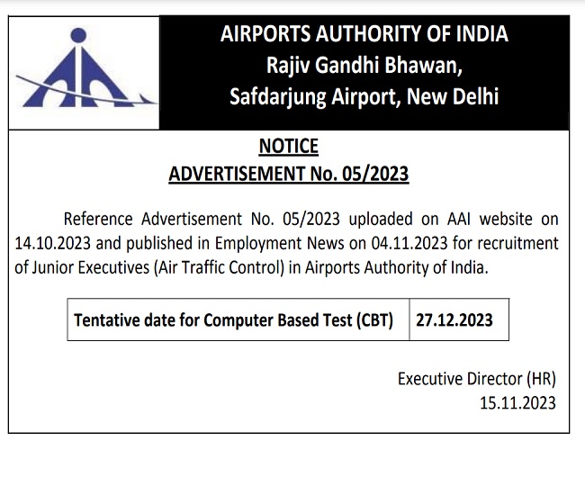 एयरपोर्ट अथॉरिटी ने इससे पहले जूनियर एग्जीक्यूटिव CBT के आयोजन की तारीख की घोषणा की थी। अथॉरिटी द्वारा 15 नवंबर को जारी अपडेट के मुताबिक कंप्यूटर बेस्ड टेस्ट का आयोजन 27 दिसंबर 2023 को किया जाना है। इसमें सम्मिलित होने के लिए उम्मीदवार अब अपना प्रवेश पत्र (AAI JE ATC Admit Card 2023) आधिकारिक वेबसाइट से डाउनलोड कर सकते हैं।