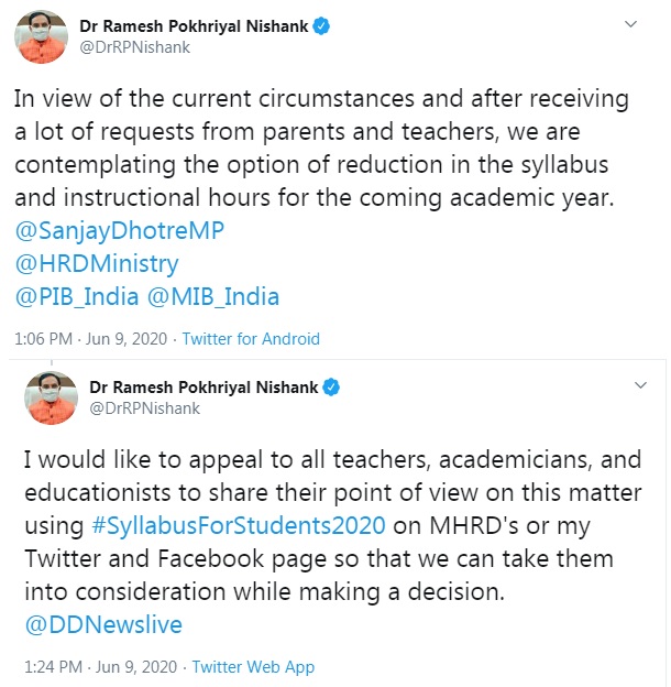 एचआरडी मंत्री ने कहा कि नये शैक्षणिक सत्र 2020-21 के लिए कम सिलेबस और पढ़ाई के घंटों पर विचार के दौरान इन सुझावों पर विचार किया जाएगा।