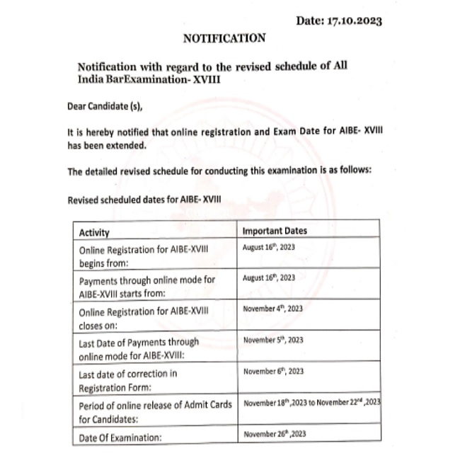 AIBE 18 Exam 2023: ऑल इंडिया बार एग्जाम स्थगित, अब 26 नवंबर को होगी परीक्षा, BCI ने दिया आवेदन का एक और मौका