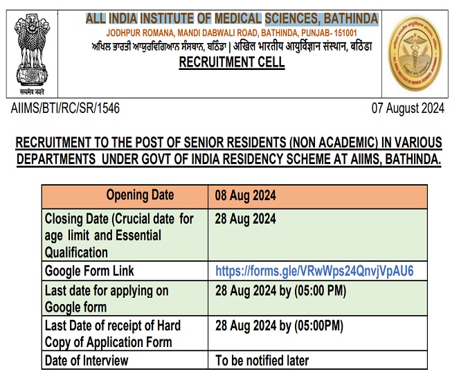 AIIMS Bathinda Recruitment 2024: एम्स बठिंडा में सीनियर रेजिडेंट पदों पर जल्द कर लें अप्लाई, 28 अगस्त है लास्ट डेट