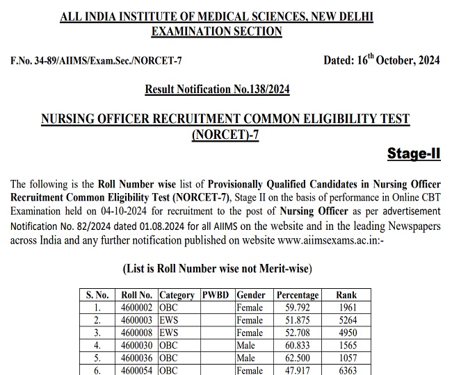 AIIMS NORCET 7 Result 2024: नर्सिंग ऑफिसर भर्ती पात्रता परीक्षा स्टेज-2 रिजल्ट हुआ घोषित, यहां से चेक करें रैंक