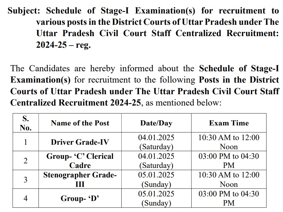इलाहबाद हाई कोर्ट की ओर से ग्रुप C एवं ग्रुप D भर्ती परीक्षा के लिए शेड्यूल जारी कर दिया गया है। जारी की गई अधिसूचना के मुताबिक 4 एवं 5 जनवरी 2025 को दो शिफ्ट में परीक्षा का आयोजन किया जायेगा। पहली शिफ्ट की परीक्षा सुबह 1030 से दोपहर 12 बजे तक वहीं दूसरी पाली की परीक्षा दोपहर 3 बजे से 430 तक आयोजित की जाएगी।