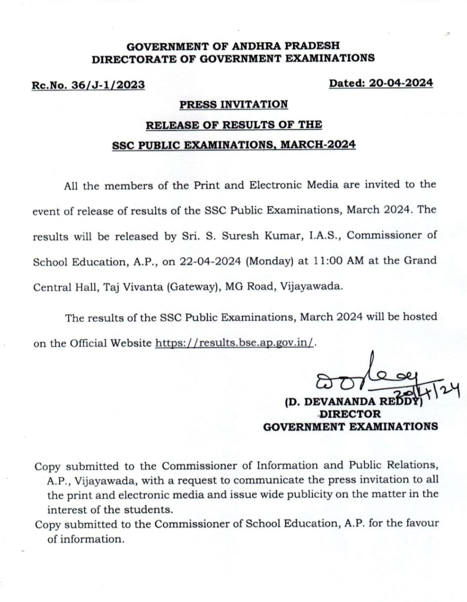 आंध्र प्रदेश परीक्षा निदेशालय की विज्ञप्ति के मुताबिक एसएससी रिजल्ट (AP SSC Result 2024) की घोषणा के लिए प्रेस कॉन्फ्रेंस का आयोजन विजयवाड़ा एमजी रोड स्थित ताज विवांता (गेटवे) के ग्रांड सेंट्रल हॉल में किया गया। आंध्र प्रदेश कक्षा 10 परीक्षाफल की घोषणा के साथ-साथ इस साल की परीक्षाओं में अधिकतम अंक प्राप्त करने वाले स्टूडेंट्स की सूची (AP SSC Toppers List 2024) भी जारी की गई।