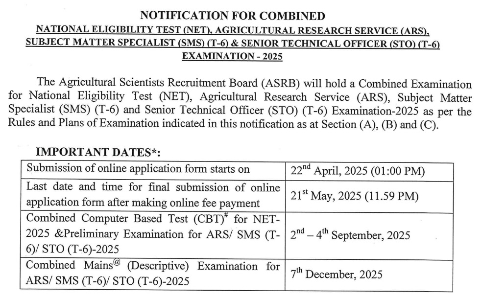 ASRB NET 2025: कृषि वैज्ञानिक भर्ती बोर्ड ने एएसआरबी नेट एग्जाम नोटिफिकेशन किया जारी, महत्वपूर्ण डेट्स यहां से करें चेक