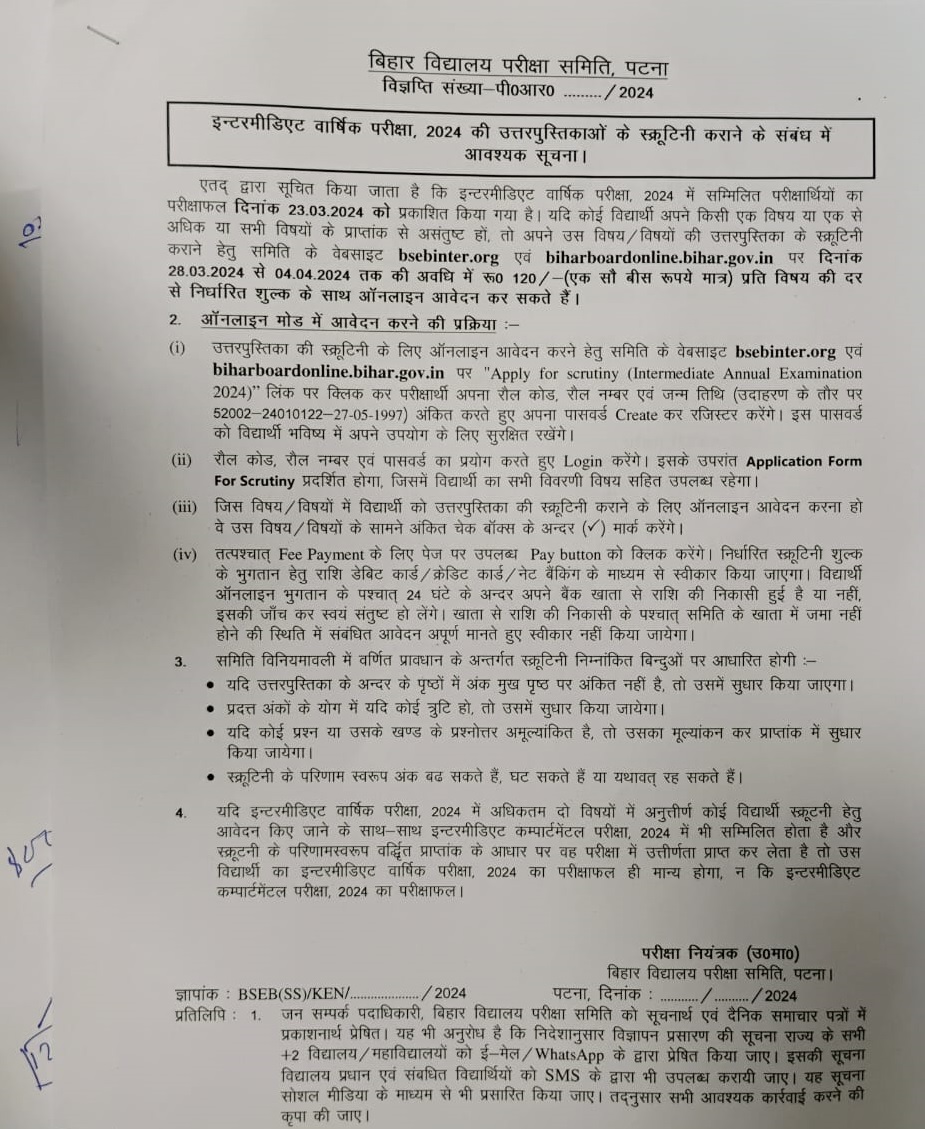 BSEB द्वारा बिहार बोर्ड इंटर स्क्रूटिनी (BSEB Inter Scrutiny Form 2024) को लेकर जारी अधिसूचना के अनुसार छात्र-छात्राएं प्रति विषय 120 रुपये के शुल्क के साथ अपनी कॉपियों की स्क्रूटिनी के लिए ऑनलाइन आवेदन कर सकते हैं। इसके लिए स्टूडेंट्स को आधिकारिक वेबसाइट, intermediate.bsebscrutiny.com पर जाना होगा। फिर अपने रोल कोड, रोल नंबर और पासवर्ड (जन्म-तिथि) के माध्यम से लॉग-इन करना होगा। लॉग-इन के बाद परीक्षार्थी स्क्रूटिनी फॉर्म भर सकेंगे, जिसकी आखिरी तारीख 4 अप्रैल 2024 निर्धारित की गई है।