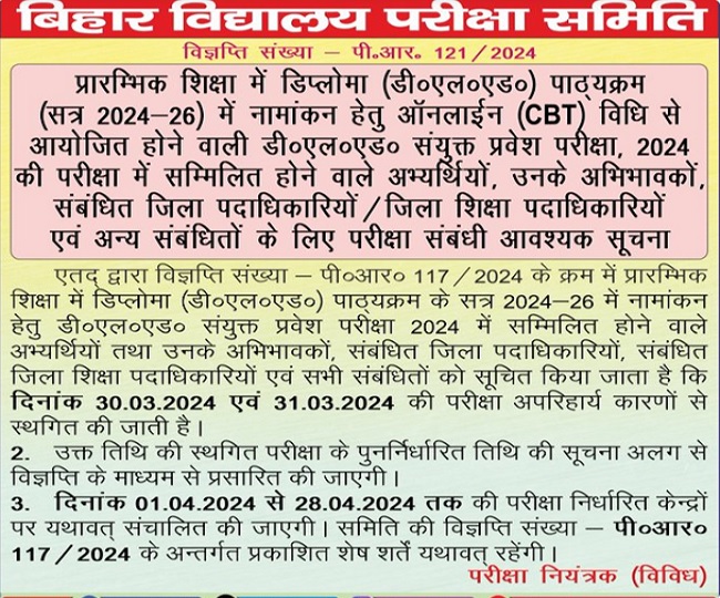 Bihar DElEd 2024: 30 एवं 31 मार्च को होने वाली बिहार डीएलएड प्रवेश परीक्षा हुई स्थगित, ये रही डिटेल