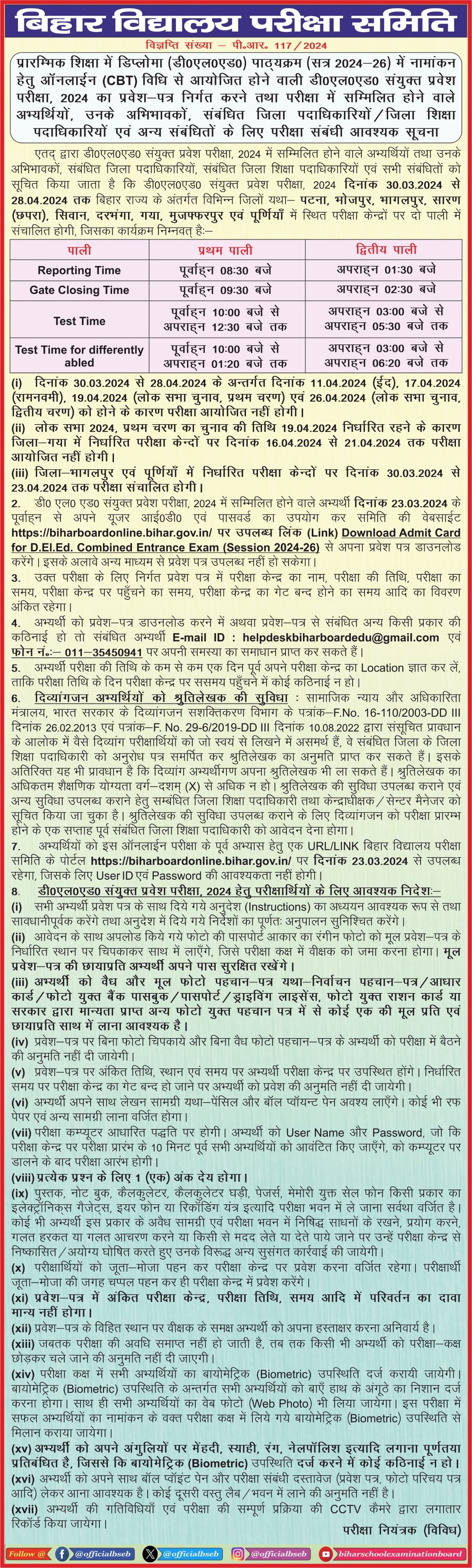साथ ही, उम्मीदवारों को ध्यान देना चाहिए कि BSEB ने आज, 22 मार्च 2024 को जारी नोटिस में बिहार डीएलएड प्रवेश परीक्षा 2024 की संशोधित तारीखों का भी ऐलान किया है। आयोग के नोटिस के अनुसार विभिन्न जिलों - पटना, भोजपुर, भागलपुर, सारण (छपरा), सिवान, दरभंगा, गया, मुजफ्फरपुर और पूर्णियाँ में परीक्षा का आयोजन 30 मार्च से 28 अप्रैल 2024 के बीच विभिन्न घोषित तिथियों पर दो पालियों में किया जाएगा। पहली पाली सुबह 10 बजे से दोपहर 12.30 बजे तक और दूसरी दोपहर 3 बजे से शाम 5.30 बजे तक आयोजित की जाएगी।