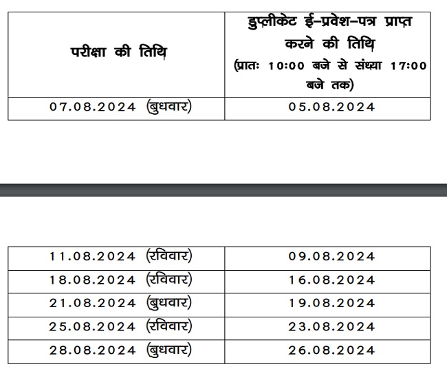 केंद्रीय चयन पर्षद (सिपाही भर्ती) की ओर से कॉन्स्टेबल भर्ती के लिए एडमिट कार्ड का लिंक 15 जुलाई को ऑफिशियल वेबसाइट csbc.bih.nic.in पर एक्टिवेट हो जायेगा जिसके बाद आवेदनकर्ता लॉग इन डिटेल दर्ज करके इसे डाउनलोड कर सकेंगे। परीक्षा का आयोजन राज्यभर के 38 जिलों में निर्धारित परीक्षा केंद्रों पर 711 18 21 25 और 28 अगस्त 2024 को किया जाएगा।