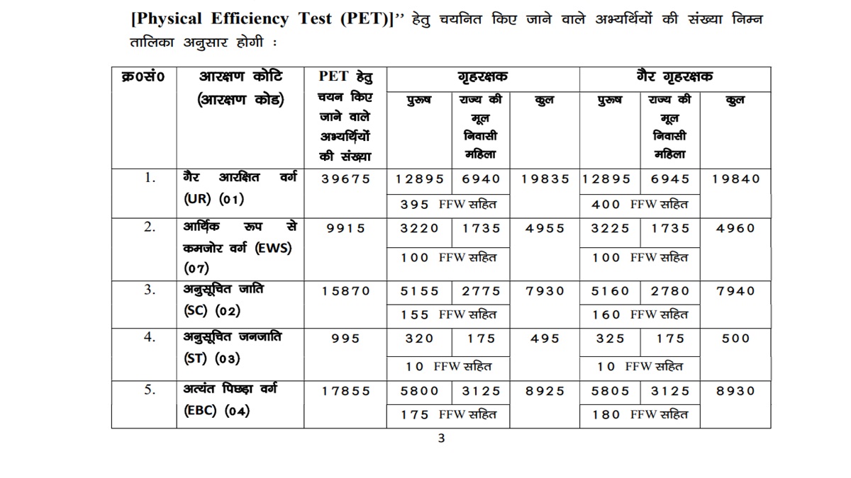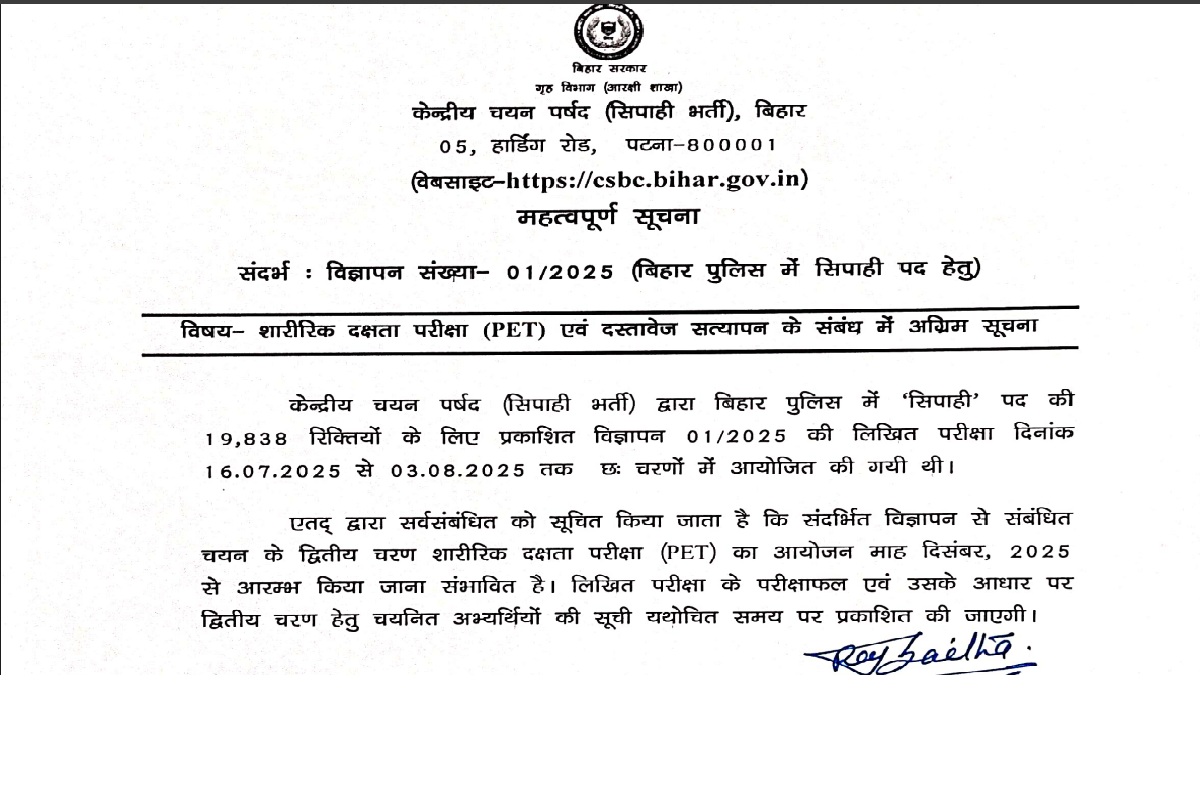 सीएसबीसी की ओर से शारीरिक दक्षता परीक्षा (पीईटी) का आयोजन दिसंबर, 2025 में किया जाएगा। जो उम्मीदवार बिहार पुलिस कांस्टेबल की लिखित परीक्षा में सफल घोषित किए गए हैं, उन्हें सलाह दी जाती है कि पीईटी परीक्षा की तिथियों से जुड़ी अधिक जानकारी के लिए समय-समय पर सीएसबीसी की आधिकारिक वेबसाइट विजिट करते रहें।