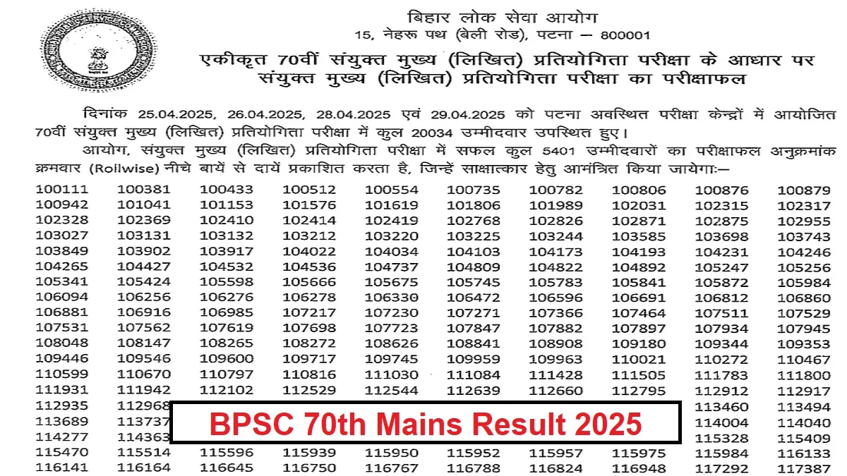 BPSC 70th Mains Result 2025: बीपीएससी 70th इंटरव्यू के लिए 5401 सफल, 2035 पदों पर होगा चयन, मेंस रिजल्ट PDF यहां करें डाउनलोड