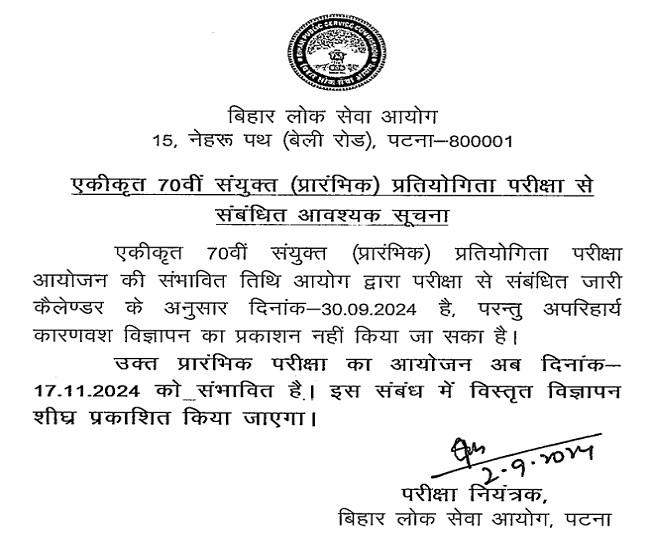 बिहार पब्लिक सर्विस कमीशन (बीपीएससी) की ओर से एकीकृत 70वीं संयुक्त (प्रारंभिक) प्रतियोगिता परीक्षा के लिए शॉर्ट नोटिफिकेशन जारी कर जानकारी साझा की गई है। अधिसूचना के मुताबिक पहले 70th प्रीलिम एग्जाम का आयोजन 30 सितंबर को प्रस्तावित था जो अब 17 नवंबर को आयोजित किया जाएगा। बीपीएससी की ओर से 70वीं संयुक्त प्रारंभिक परीक्षा के लिए आवेदन जल्द ही स्टार्ट किये जाएंगे।