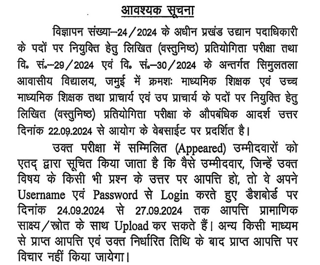 उत्तर कुंजी डाउनलोड करने के बाद अभ्यर्थी इससे अपने सभी प्रश्न उत्तरों का अच्छे से मिलान कर लें। इस दौरान अगर वे इसमें दिए किसी आंसर की से संतुष्ट नहीं हैं तो निर्धारित अंतिम तिथि 27 सितंबर तक आपत्ति दर्ज कर सकते हैं। अभ्यर्थी आंसर की पर आपत्ति डैशबोर्ड में जाकर यूजर नेम एवं पासवर्ड दर्ज करके लॉग इन करें और प्रश्न को सेलेक्ट करके अपनी आपत्ति दर्ज कर दें।