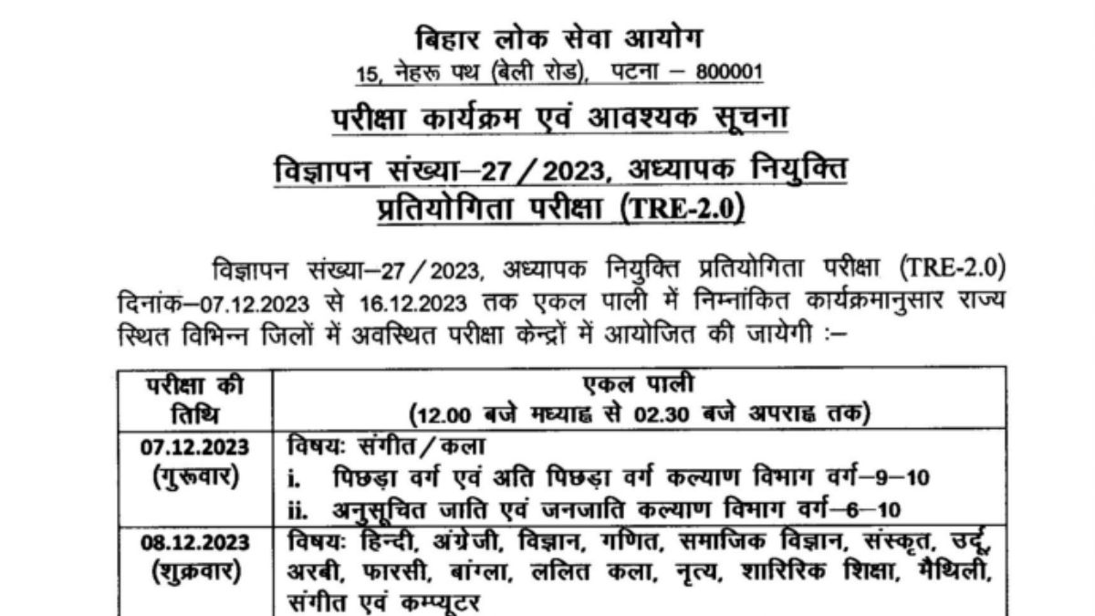 आयोग की ओर से इस संबंध में आधिकारिक सूचना भी जारी की गई है। इसके अनुसार, आयोग ने विज्ञापन संख्या- 27/ 2023 अध्यापक नियुक्ति प्रतियोगित परीक्षा (TRE-2.0) का आयोजन 07 से 16 दिसंबर तक किया जाएगा। यह परीक्षा सिंगल पाली में आयोजित की जाएगी। शेड्यूल के अनुसार, पहले दिन यानी कि 7 दिसंबर, 2023 को पिछड़ा वर्क एवं अति पिछड़ा वर्ग कल्याण विभाग वर्ग- 9- 10 और सेकेंड अनुसूचित जाति एवं जनजाति कल्याण विभाग वर्ग- 6- 10 के लिए संगीत/ कला परीक्षा का आयोजन किया जाएगा।