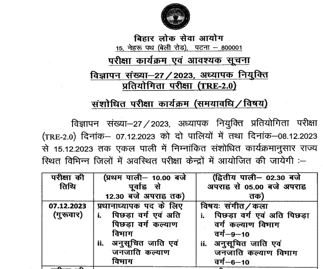 बिहार पब्लिक सर्विस कमीशन (BPSC) की ओर से नोटिफिकेशन जारी कर बीपीएससी शिक्षक भर्ती (BPSC TRE 2) 2023 के लिए रिवाइज्ड एग्जाम डेट्स की घोषणा कर दी है। नोटिफिकेशन के अनुसार परीक्षा का आयोजन 7 दिसंबर से 15 दिसंबर तक किया जाएगा। 7 दिसंबर को परीक्षा दो शिफ्ट में जबकि अन्य दिन एग्जाम का आयोजन केवल एक शिफ्ट में संपन्न करवाया जाएगा।