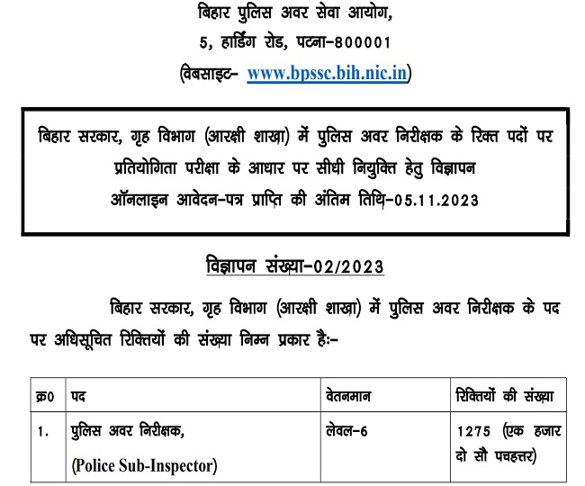 Bihar Police SI Bharti 2023 Notification बिहार पुलिस अधीनस्थ सेवा आयोग की ओर से सब इंस्पेक्टर के 1275 पदों पर होने वाली भर्ती के लिए नोटिफिकेशन जारी कर आवेदन तिथियों को घोषित कर दिया गया है। इस भर्ती के लिए ऑनलाइन आवेदन प्रक्रिया 5 अक्टूबर 2023 से शुरू हो जाएगी। योग्य एवं पात्र उम्मीदवार 5 नवंबर तक फॉर्म भर सकेंगे।