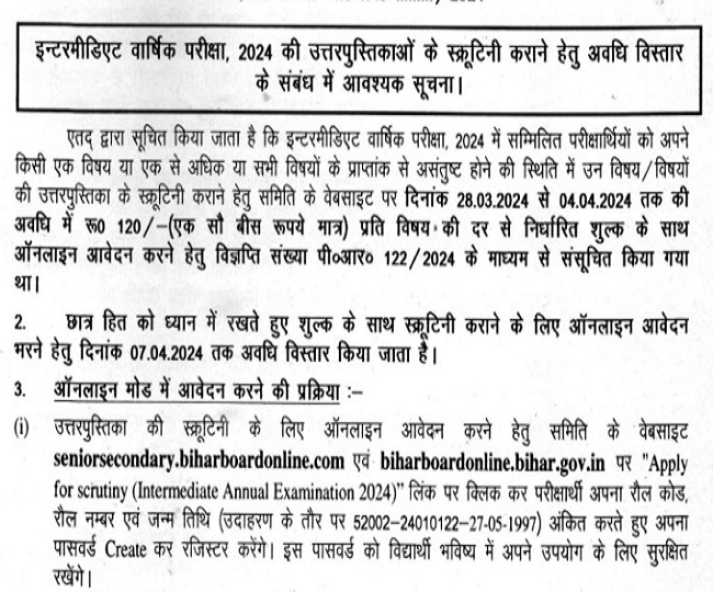 BSEB 12th Exam 2024: बिहार बोर्ड ने इंटरमीडिएट कंपार्टमेंट एग्जाम एवं स्क्रूटिनी के लिए आवेदन तिथि बढ़ाई, कल तक कर सकते हैं अप्लाई