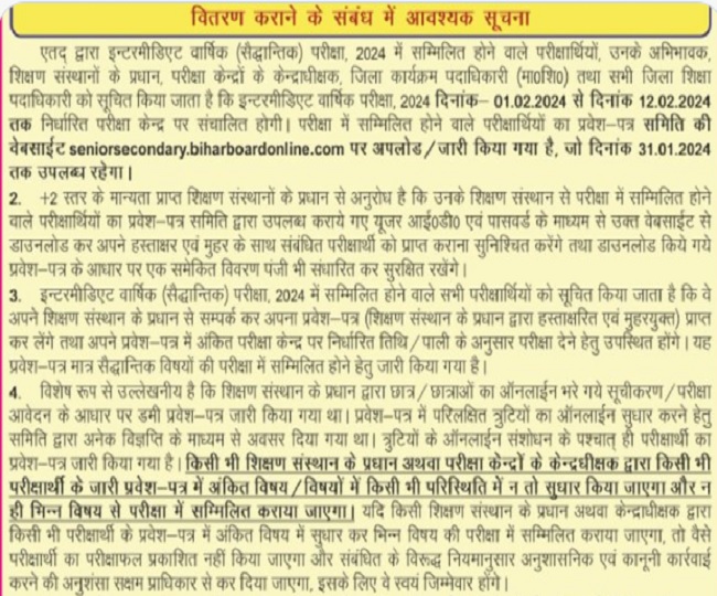 बिहार बोर्ड की ओर से एडमिट कार्ड जारी होने के साथ ही जानकारी साझा की गयी है। इसमें बताया गया है कि यह एडमिट कार्ड फाइनल हैं और इसमें अब सुधार नहीं किया जा सकता है। अतः किसी ही संस्थान के प्रधान अथवा परीक्षा केंद्रों के अधीक्षक द्वारा किसी भी परीक्षार्थी के जारी प्रवेश पत्र में अंकित विषय/ विषयों में किसी भी परिस्थिति में न तो सुधार किया जायेगा और न ही भिन्न विषय से परीक्षा में सम्मिलित कराया जाएगा।