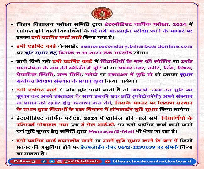 बिहार बोर्ड इंटर परीक्षा 2024 के लिए करीब 15 लाख छात्र-छात्राओं ने फॉर्म भरा है। अब ये स्टूडेंट्स परीक्षाओं के लिए मूल प्रवेश पत्र से पहले जारी किए किए डमी एडमिट कार्ड को अपने स्कूल से प्राप्त करके इसमें किसी भी प्रकार की त्रुटि में सुधार करा सकते हैं। छात्र-छात्राओं को ध्यान देना चाहिए बीएसईबी ने बिहार बोर्ड 12वीं डमी एडमिट कार्ड 2023 में सुधार कराने की आखिरी तारीख 11 नवंबर निर्धारित की है। त्रुटि सुधार के लिए छात्र-छात्राओं को अपने विद्यालय में ही संपर्क करना होगा।