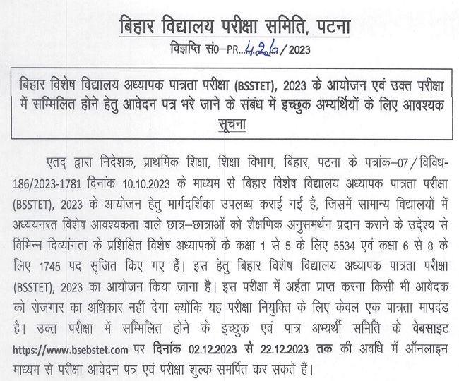 BSSTET 2023: बिहार विशेष शिक्षक पात्रता परीक्षा के लिए शुरू हुए आवेदन, ऑनलाइन कर सकते हैं अप्लाई