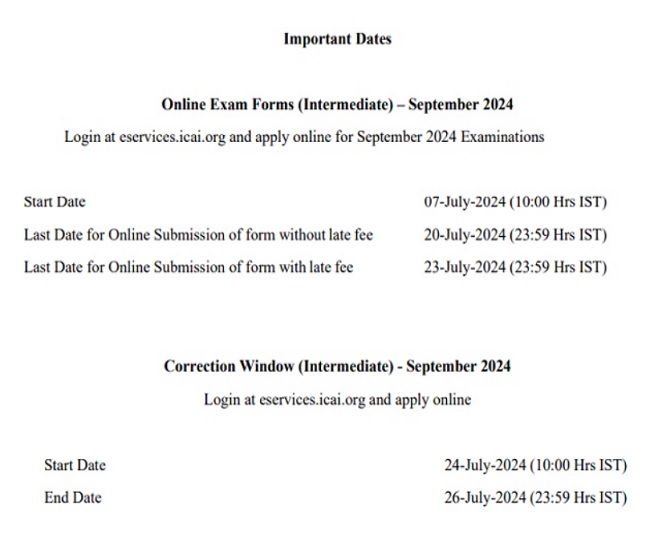चार्टर्ड एकाउंटेंट (CA) के इंटरमीडिएट कोर्स में शामिल होने के लिए इच्छुक अभ्यर्थी बिना लेट फीस के आज रात्रि 11 बजकर 59 मिनट तक ऑनलाइन माध्यम से आवेदन कर सकते हैं। आज के बाद अभ्यर्थी विलम्ब शुल्क के साथ 23 जुलाई 2024 तक ऑनलाइन फॉर्म भर पायेंगे। आवेदन में गलती होने पर अभ्यर्थी 24 से 26 जुलाई तक उसमें संशोधन कर सकेंगे।