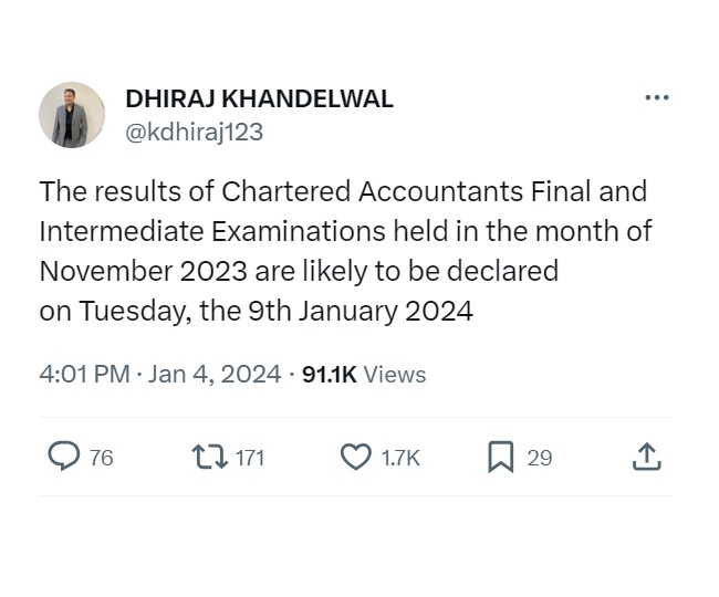 आइसीएआइ के सीसीएम ने सीए फाइनल और इंटर रिजल्ट नवंबर 2023 की घोषणा को लेकर आधिकारिक अपडेट अब से कुछ ही देर पहले सोशल मीडिया पर जारी किया।