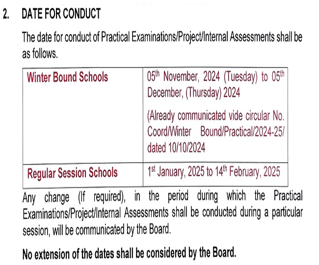 सेन्ट्रल बोर्ड ऑफ सेकेंडरी एजुकेशन (CBSE) की ओर से 10th एवं 12th दोनों ही कक्षाओं के लिए प्रायोगिक परीक्षाओं का आयोजन 1 जनवरी से 14 फरवरी 2024 तक करवाया जायेगा। 15 फरवरी से दोनों ही कक्षाओं के लिए थ्योरी एग्जाम की शुरुआत हो जाएगी। सेकेंडरी क्लास का अंतिम पेपर 18 मार्च को और सीनियर सेकेंडरी का अंतिम पेपर 4 अप्रैल 2025 को होगा।