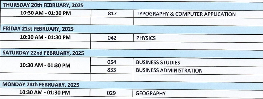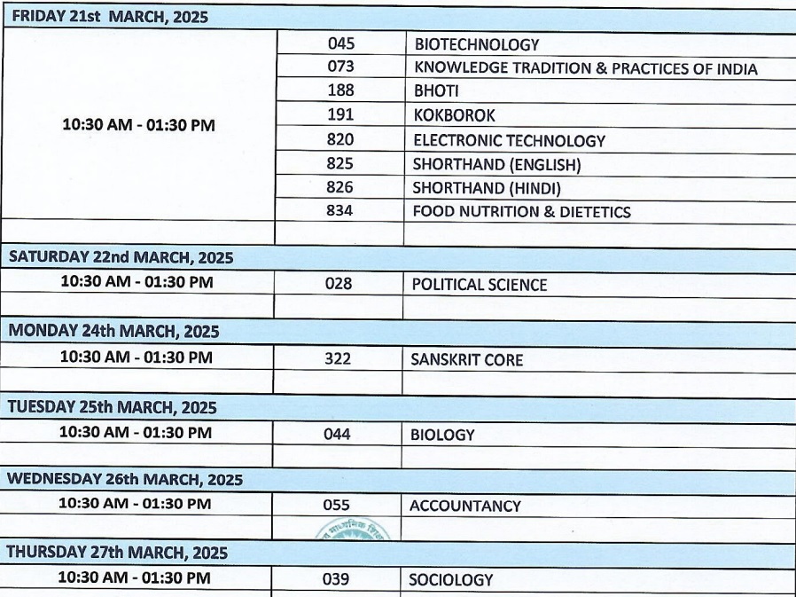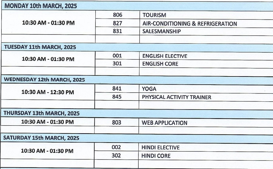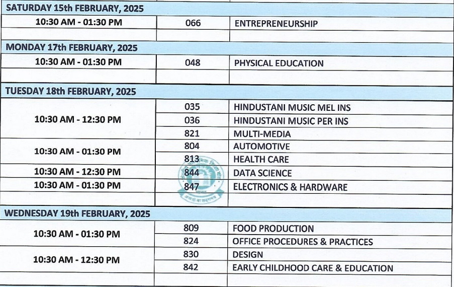 सेंट्रल बोर्ड ऑफ सेकेंडरी एजुकेशन (CBSE) की ओर से सीनियर सेकेंडरी (12th) के लिए टाइम टेबल जारी कर दिया गया है। डेट शीट के अनुसार 12वीं कक्षा का पहला पेपर 15 फरवरी 2025 को एंटरप्रेन्योरशिप विषय का आयोजित किया जायेगा। अंतिम पेपर 4 अप्रैल को साइकोलॉजी विषय को होगा। डेट एवं विषय के अनुसार पूरा टाइम टेबल इस पेज से चेक कर सकते हैं।
