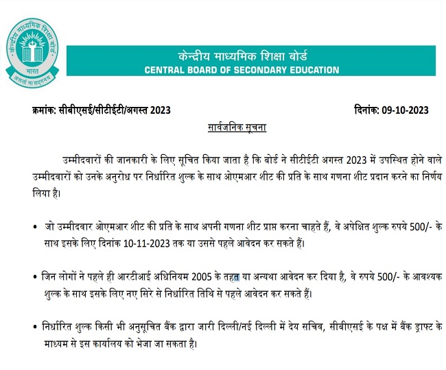 सीबीएसई द्वारा सोमवार, 9 अक्टूबर 2023 को जारी नोटस के अनुसार जो उम्मीदवार अपनी ओएमआर शीट की प्रति के साथ गणना शीट प्राप्त करना चाहते हैं, वे 500 रुपये शुल्क के साथ निर्धारित अंतिम तिथि 10 नवंबर तक आवेदन कर सकते हैं।