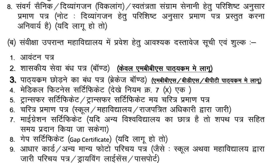 राज्य के सरकारी महाविद्यालयों में प्रवेश के लिए अनरिजर्व श्रेणी के उम्मीदवारों को 10000 रुपये और एससी, एसटी और ओबीसी वर्ग को 5000 रुपये सिक्योरिटी/ रजिस्ट्रेशन फीस जमा करना होगा। इसके अलावा निजी महाविद्यालयों में प्रवेश लेने पर सभी वर्ग के अभ्यर्थियों को सिक्योरिटी/ रजिस्ट्रेशन फीस के लिए 100000 रुपये जमा करना होगा।