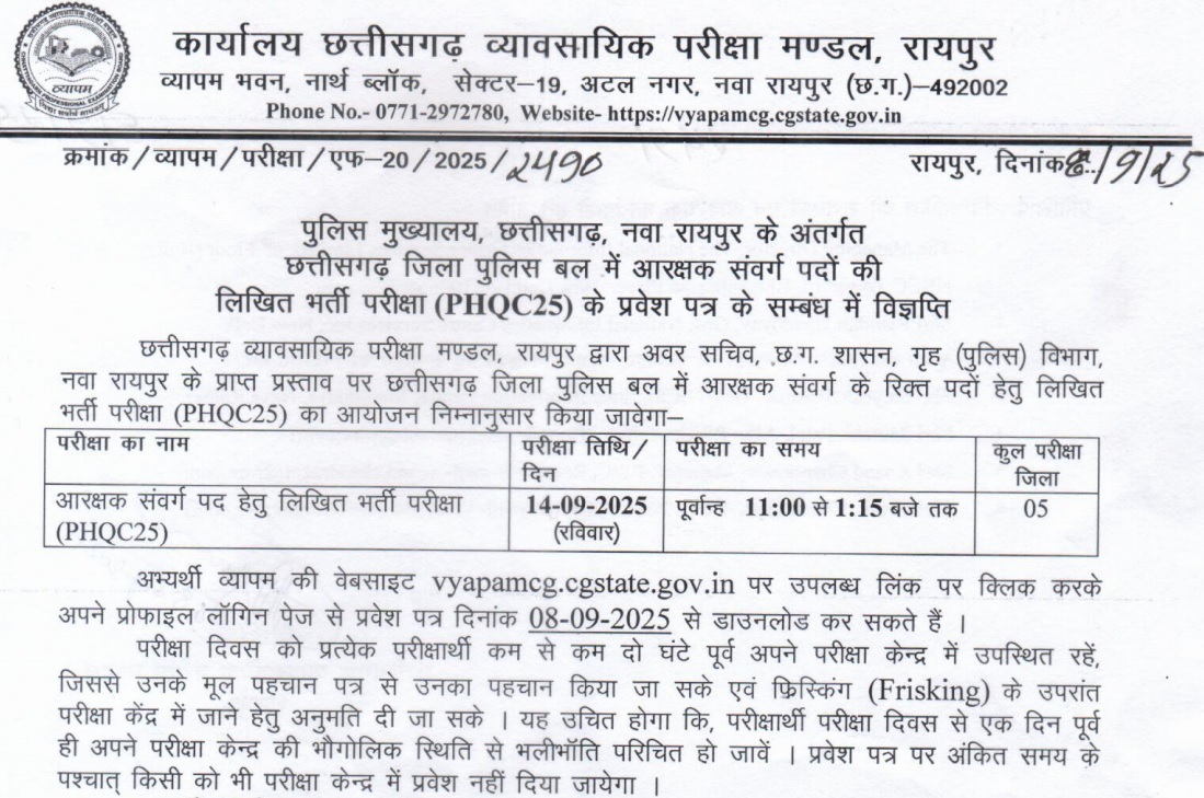 सीजी व्यापम की ओर से साझा की गई डिटेल के मुताबिक पुलिस मुख्यालय, छत्तीसगढ़, नवा रायपुर के अंतर्गत छत्तीसगढ़ जिला पुलिस बल में आरक्षक संवर्ग पदों की लिखित भर्ती परीक्षा (PHQC25) का आयोजन 14 सितंबर 2025 (रविवार) को कुल 5 जनपदों में किया जायेगा। एग्जाम एक शिफ्ट में संपन्न होगा जिसके लिए टाइमिंग सुबह 11 बजे से लेकर दोपहर 1 बजकर 15 मिनट तक रहेगी।
