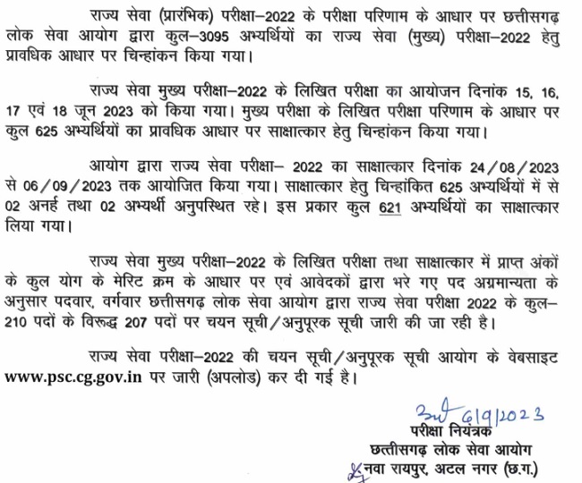 आपको बता दें कि प्रारंभिक परीक्षा में 3095 लोगों को चुना गया था जिसके बाद मुख्य परीक्षा का आयोजन 15, 16, 17 एवं 18 जून को करवाया गया था। मुख्य परीक्षा के आधार पर कुल 625 उम्मीदवारों को शॉर्टलिस्ट करके इंटरव्यू प्रक्रिया के लिए आमंत्रित किया गया था। इंटरव्यू प्रक्रिया का आयोजन 24 अगस्त 2023 से 6 सितंबर 2023 तक किया गया जिसके बाद अब सीजीपीएससी की ओर से फाइनल रिजल्ट की घोषणा कर दी गयी है। इंटरव्यू में 621 उम्मीदवारों ने भाग लिया था जिसमें से 210 पदों के विरुद्ध 207 पदों पर चयन सूची/ अनुपूरक सूची जारी की गयी है।