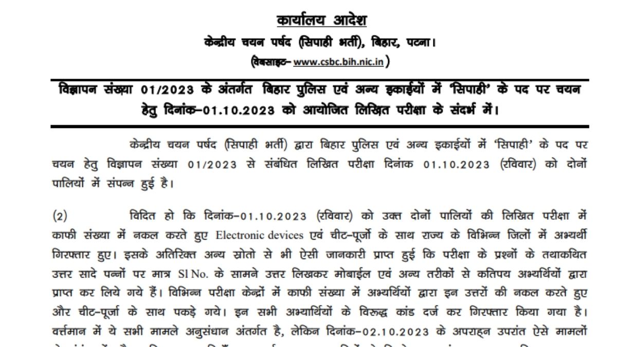 एजुकेशन डेस्क, नई दिल्ली। Bihar Police Constable Exam: बिहार पुलिस कॉन्स्टेबल भर्ती परीक्षा के संबंध में सीएसबीसी ने अहम फैसला लिया है। केंद्रीय चयन पर्षद (Central Selection Board of Constable, CSBC) की ओर एक अक्टूबर, 2023 को आयोजित हुई सिपाही भर्ती परीक्षा की कैंसिल कर दी गई है। पर्षद ने इस संबंध में जानकारी देते हुए कहा है कि, 1 अक्टूबर, 2023 को दोनों पालियों की लिखित परीक्षा में काफी संख्ख्या में नकल करते हुए इलेक्ट्रानिक्स डिवाइस के साथ राज्य के विभिन्न जिलों में अभ्यर्थी गिरफ्तार हुए हैं। इस परीक्षा से जुड़े अभ्यर्थी पोर्टल पर जाकर इससे संबंधित नोटिफिकेशन की जांच कर कर सकते हैं। अगर अभ्यर्थी चाहें तो नीचे दिए गए डायरेक्ट लिंक पर क्लिक करके भी सूचना को पढ़ सकते हैं।