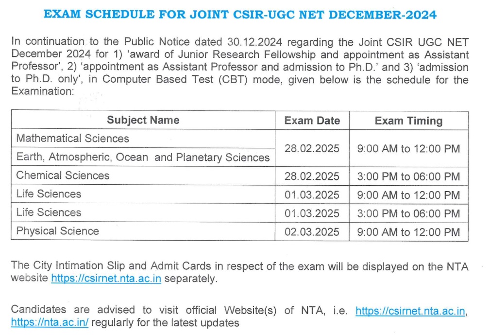 एजुकेशन डेस्क, नई दिल्ली। सीएसआईआर नेट दिसंबर 2024 एग्जाम का आयोजन 28 फरवरी से लेकर 2 मार्च 2025 तक करवाया जायेगा। एग्जाम में शामिल होने के लिए राष्ट्रीय परीक्षा एजेंसी (NTA) की ओर से एडमिट कार्ड कभी भी डाउनलोड के लिए जारी किये जा सकते हैं। प्रवेश पत्र ऑनलाइन माध्यम से एनटीए की ऑफिशियल वेबसाइट csirnet.nta.ac.in पर जारी किये जाएंगे। इसके बाद आवेदनकर्ता लॉग इन डिटेल दर्ज करके हॉल टिकट डाउनलोड कर पाएंगे। किसी भी अभ्यर्थी को डाक या अन्य माध्यम से प्रवेश पत्र नहीं भेजे जाएंगे।