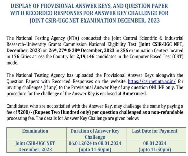 सीएसआईआर यूजीसी नेट दिसंबर 2023 एग्जाम का आयोजन 26 से 28 दिसंबर तक किया गया था जिसके बाद अब नेशनल टेस्टिंग एजेंसी (NTA) की ओर से उम्मीदवारों के लिए आंसर की जारी कर दी गयी है। अभ्यर्थी आंसर की ऑफिशियल वेबसाइट पर जाकर डाउनलोड करके प्रश्न उत्तरों का मिलान कर सकते हैं और कल तक उस पर आपत्ति भी दर्ज कर सकते हैं।