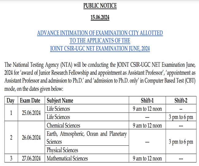 एनटीए की ओर से सीएसआईआर नेट जून सेशन की परीक्षा 25, 26 एवं 27 जून 2024 को देशभर में निर्धारित परीक्षा केंद्रों पर आयोजित की जाएगी। एग्जाम का आयोजन दो शिफ्ट में किया जाएगा। पहली शिफ्ट की परीक्षा सुबह 9 बजे से लेकर दोपहर 12 बजे तक एवं दूसरी शिफ्ट की परीक्षा दोपहर 3 बजे से शाम 6 बजे तक संपन्न करवाई जाएगी।