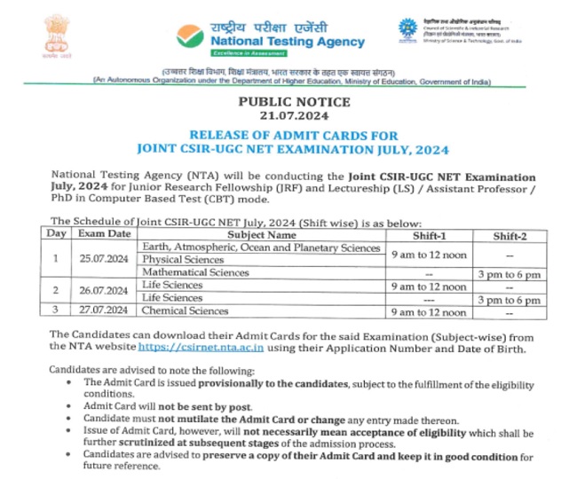 NTA ने CSIR-UGC NET जुलाई 2024 की परीक्षा तिथियों की घोषणा भी पहले ही कर दी थी। आधिकारिक कार्यक्रम के मुताबिक परीक्षा का आयोजन 25 से 27 जुलाई तक किया जाएगा। तीनों ही निर्धारित तिथियों पर परीक्षा सुबह 9 से 12 बजे तक और फिर दोपहर 3 बजे से शाम 6 बजे तक आयोजित की जाएगी।