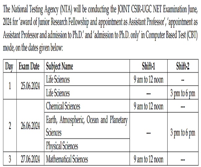 सीएसआईआर यूजीसी नेट एग्जाम 2024 का आयोजन 25, 26 एवं 27 जून को दो शिफ्ट में आयोजित करवाया जाएगा। पहली शिफ्ट की परीक्षा सुबह 9 बजे से दोपहर 12 बजे तक एवं दूसरी शिफ्ट की परीक्षा दोपहर 3 बजे से शाम 6 बजे तक संपन्न करवाई जाएगी। 27 जून को परीक्षा केवल सुबह वाली शिफ्ट में ही आयोजित की जाएगी।