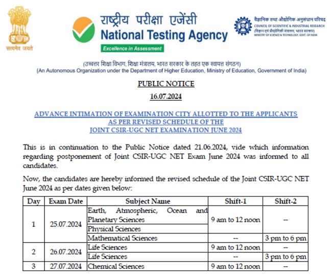एजुकेशन डेस्क, नई दिल्ली। सीएसआइआर यूजीसी नेट जून 2024 परीक्षा के लिए पंजीकृत उम्मीदवारों के लिए अपडेट। राष्ट्रीय परीक्षा एजेंसी (NTA) ने सीएसआइआर-यूजीसी की संयुक्त राष्ट्रीय पात्रता परीक्षा के जून 2024 सत्र में सम्मिलित होने के लिए पंजीकृत उम्मीदवारों को आवंटित परीक्षा की जानकारी के लिए एग्जाम सिटी स्लिप जारी कर दिए हैं। एजेंसी द्वारा स्लिप मंगलवार, 16 जुलाई को जारी किए गए और इन्हें डाउनलोड करने के लिए लिंक को आधिकारिक वेबसाइट, csirnet.nta.ac.in पर एक्टिव कर दिया गया है।