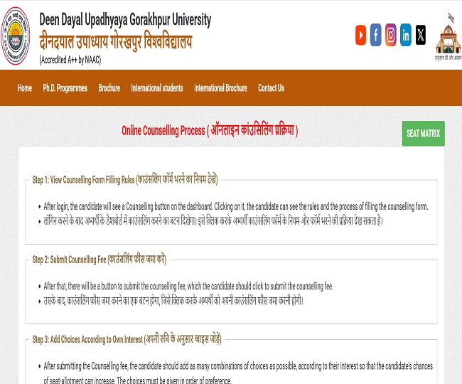 काउंसिलिंग के लिए डीडीयू की ओर से ऑफिशियल वेबसाइट पर पूरी डिटेल दी गई है। छात्र नीचे दी जा रही स्टेप्स को फॉलो कर आसानी से काउंसिलिंग में भाग लेकर सीट च्वाइस फिलिंग/ लॉकिंग कर सकते हैं।
