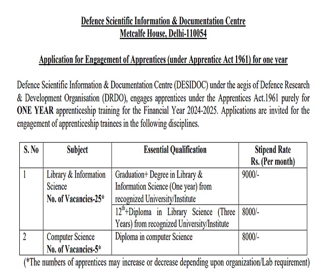 जॉब डेस्क, नई दिल्ली। रक्षा अनुसंधान एवं विकास संगठन (DRDO) की ओर से रक्षा वैज्ञानिक सूचना एवं प्रलेखन केंद्र (DESIDOC) में अप्रेंटिसशिप पदों पर भर्ती निकाली गयी है। इस भर्ती के लिए नोटिफिकेशन जारी कर आवेदन प्रक्रिया शुरू कर दी गयी है। जो भी उम्मीदवार इस भर्ती में शामिल होना चाहते हैं उनको पहले ऑनलाइन माध्यम से अप्रेंटिसशिप पोर्टल mhrdnats.gov.in या nats.education.gov.in पर खुद को रजिस्टर करना होगा।